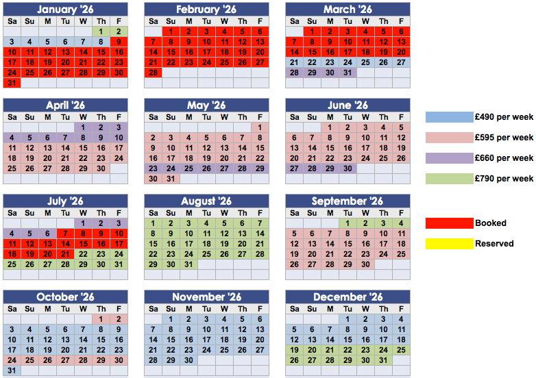 To book your dates as quickly as possible: Check availability and price on this page then email or call us to reserve your dates. Then, download our booking form (PDF), print, complete and return with the deposit cheque, or pay online (ask for details), sorry but no credit card facilities.